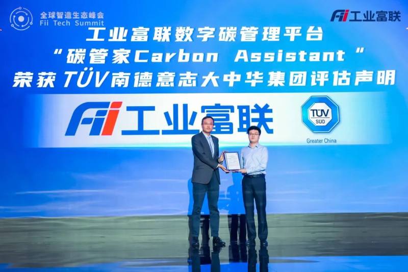 此次峰会上,TUV南德集团签证官张德法为工业富联自主研发的数字碳管理工具--碳管家Carbon Assistant现场颁发产品符合性声明TUV南德认证证书,并表示:“工业富联的碳管家平台实现了数字化和可持续发展两个特点的完美融合,在认证之初就兼容考虑了国内外主要碳核查、碳减排标准,可以让用户更加快速、便捷、准确完成碳排放的摸底工作,为今后制定自己的碳中和策略、碳减排策略提供帮助,是一款非常有意义的产品。”