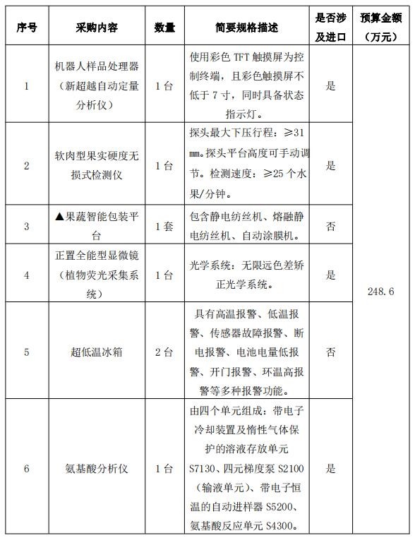 【仪表网 招标采购】3月29日,中国政府采购网发布了北京市农林科学院果蔬采后科研仪器设备的购置公开招标公告,项目预算金额248.6万元,采购机器人样品处理器(新超越自动定量分析仪)、软肉型果实硬度无损式检测仪、旋转蒸发等科研仪器设备。