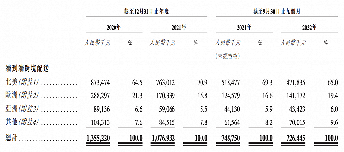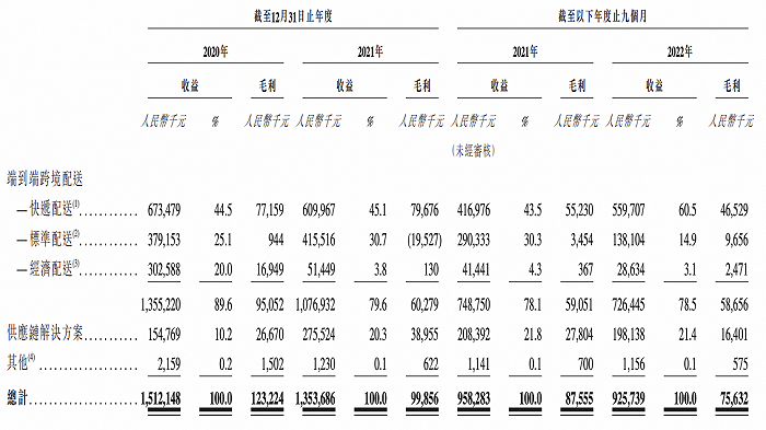 其中端到端跨境配送服务为营收主力。2020年、2021年以及截至2022年9月30日止九个月,该服务分别录得收入13.5亿元、10.76亿元、7.26亿元,占总营收比重为89.6%、79.6%、78.5%。