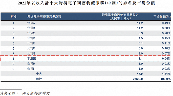 招股书中提及,根据弗若斯特沙利文报告,按2021年跨境电子商务物流业收入计,泛远国际于中国跨境电子商务物流市场排名第八,市场份额为0.04%,前十名供应商市场占比共计1.61%。