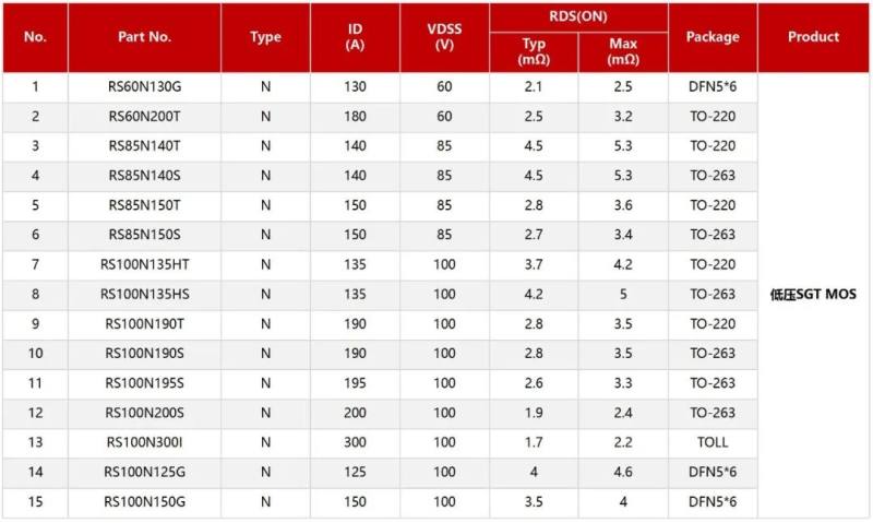 MOS管在电动车控制器中的作用非常重要,MOS管输出电流就是用来驱动电机,电流输出越大,电机扭矩就强,加速就有力。瑞森半导体在电动车控制器产品上主推低压SGT MOS系列,产品具备如下优势: