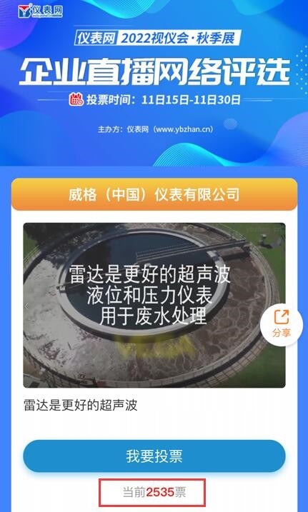 【仪表网 本站速递】由仪表网主办的2022视仪会·秋季展“企业直播网络评选”活动落下帷幕,通过激烈的角逐,威格(中国)仪表有限公司(下称“威格中国”)的直播作品“雷达是更好的超声波,液位和压力仪表用于废水处理”以2535票成功入选“仪表网视仪会企业直播优胜奖”榜单。
