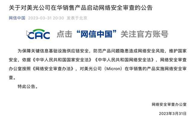 【新科技讯】3月31日晚间,网络安全审查办公室发布《关于对美光公司在华销售产品启动网络安全审查的公告》:为保障关键信息基础设施供应链安全,防范产品问题隐患造成网络安全风险,维护国家安全,依据《中华人民共和国国家安全法》《中华人民共和国网络安全法》,网络安全审查办公室按照《网络安全审查办法》,对美光公司(Micron)在华销售的产品实施网络安全审查。
