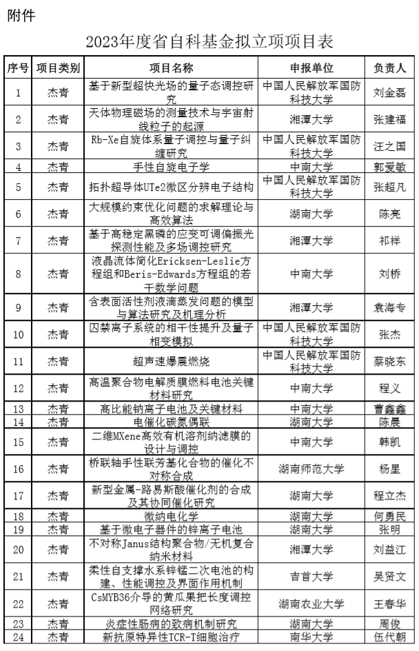 湖南省自然科学基金面向全省创新发展需求,资助自然科学及与自然科学相交叉学科领域的基础研究与应用基础研究。2023年03月29日,湖南省科技厅公示了2023年自然科学基金拟立项项目情况,其中包括100项杰青项目、100项优青项目、1019项面上项目、1067项青年基金、以及1152项联合基金,共计3438项拟立项项目,遵循“尊重科学、激励创新、促进合作、平等竞争”的原则,旨在促进学科交叉融合,培养科学技术人才,增强全省创新能力。