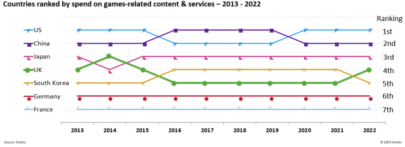 该研究还按过去十年在游戏相关内容和服务上的支出对各国进行了排名,其中美国、中国、日本、英国和韩国位居前五。