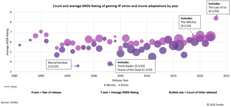 年度游戏IP系列及电影改编作品数量与平均IMDB评分