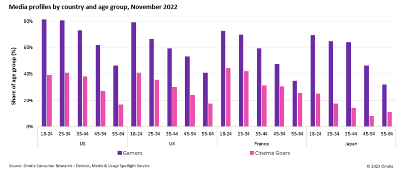 此外,Omdia的研究发现,在所有年龄段,游戏玩家的规模都要比电影观众大得多。在美国,超过50%的55-64岁人口更喜欢游戏而不是电影,而英国和德国的女性手游玩家人数处于领先地位。