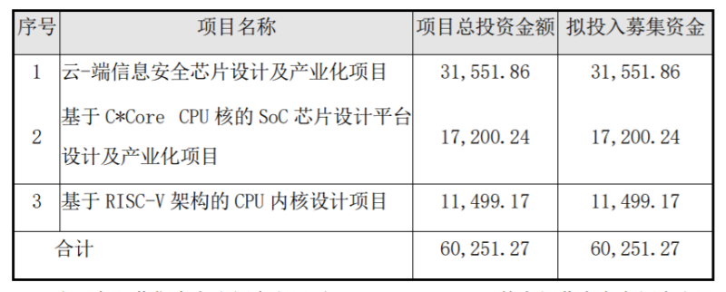 依据《苏州国芯科技股份有限公司首次公开发行股票并在科创板上市招股说明书》,募集资金投资项目具体为“云-端信息安全芯片设计及产业化项目”“基于 C*Core CPU核的SoC芯片设计平台设计及产业化项目”“基于RISC-V架构的CPU内核设计项目”。