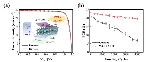 图(a)预埋3AAH的柔性钙钛矿太阳能电池器件结构以及J-V特性曲线;(b) 柔性器件在曲率半径为5mm下的机械耐弯折性能