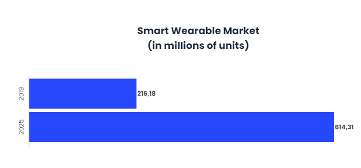 2019年智能可穿戴设备的市场价值为2.1618亿台,预计2025年将达到6.1431亿台,在2020年至2025年的预测期内,年复合增长率为19.1%。