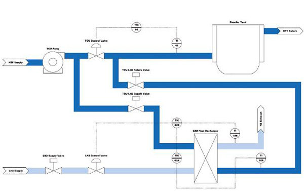 一旦通过液氮热交换器建立流量,液氮供应阀将打开,液氮热交换器回路(TIC-02A/B)将调节控制阀以允许液氮进入热交换器。级联回路使用热交换器氮气出口温度(TI-02B),作为内回路(TIC-02 B)的过程参数,使用热交换器传热流体出口温度(TI-02A)作为外回路(TIC-02A)的过程参数。最初,设计工程师为离开换热器的传热流体设置了-78℃的固定温度设定值。