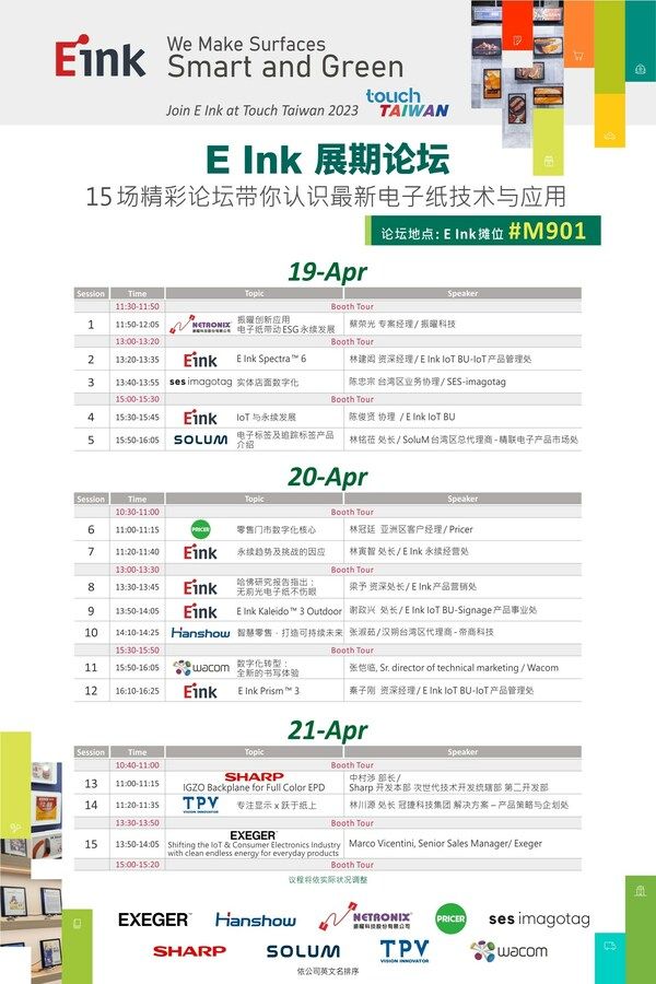 除了展示全系列彩色、低碳电子纸技术及产品应用之外,元太科技更邀请多家智慧应用领域的生态圈伙伴共展,并于三天展期间举办15场现场论坛演讲,为参观者介绍更多低碳电子纸技术与应用,议程请见E Ink元太科技网站。https://cn.eink.com/news/detail/touchtaiwan2023