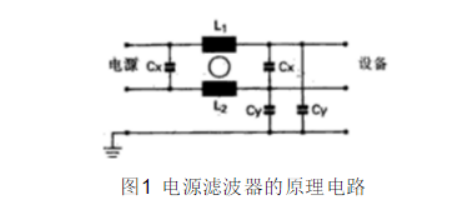 图1是电源滤波器的原理电路。图中L1和L2对共模干扰信号(不对称干扰电流)和电源电流具有低阻抗性,以确保电源电流衰减,抑制电流噪声。通常是L1、L2值很小,相等,对称绕在同一螺旋管上,使磁性材料在正常工作电流范围内产生的磁性相互补偿,但对于不对称干扰(共模)信号,两个线圈产生的磁场相互加强,外部总电感显著增加,大大抑制了L1对称干扰重量、L2和相线与零线之间的电容Cx。除了使用电容Cx(由于相线与零线之间的泄漏电流限制)外,还可以进一步衰减对称干扰。为了使Cx非常大),还可以使用非补偿性扼流圈。