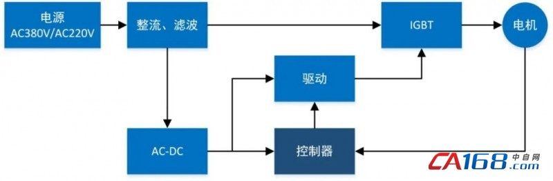 驱动器的工作原理是先将三相(或单相)电压整流、滤波得到直流电,然后使用 SVPWM 技术产生调制信号,驱动三相逆变电路,合成出等效的三相正弦电压来驱动电机。