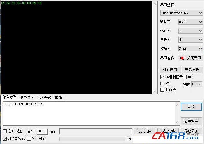 若只使用485调速,为防止误动作,用串口助手软件以16进制发送命令:01 06 00 06 00 00 69 CB,即可将模拟调速功能失能。