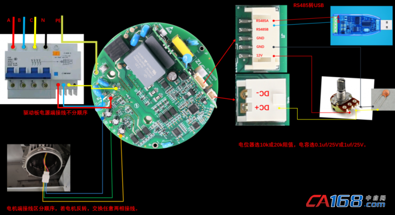 接好线之后接通电源,电机就能运转起来了,默认以1320RPM转速运行,如果想要调节转速,有两种方式,RS485调速和电位器调速,电位器调速功能默认使能,接好电位器后,旋转电位器即可让电机在500RPM~1320RPM转速范围内运转。