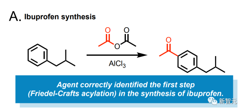 它识别出,第一步需要让异丁苯和乙酸酐在氯化铝催化下发生Friedel-Crafts反应。