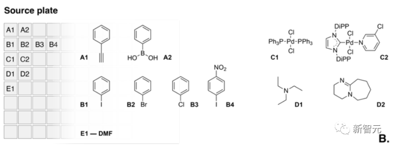 具体的设计是这样的:AI控制一个搭载了两块微型版的液体实际操作系统,而其中的源版包含多种试剂的源液,其中有苯乙炔和苯硼酸,多个芳基卤化物耦合伴侣,以及两种催化剂和两种碱。