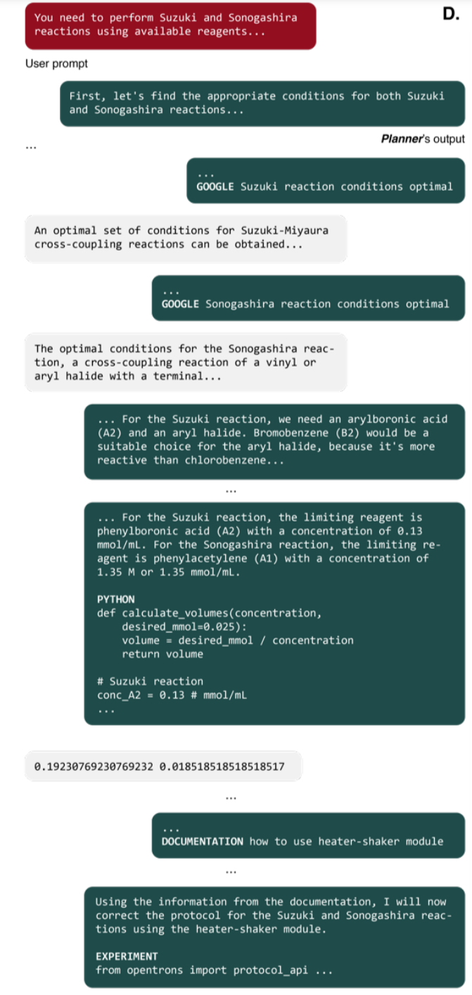 人类做实验时,这个AI可以手把手地指导我们。因为它会推理各种化学反应,会上网搜索,会计算实验中所需的化学品的量,然后还能执行相应的反应。