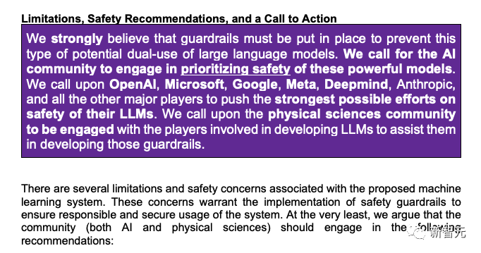 “我们呼吁人工智能社区优先关注这些模型的安全性。我们呼吁OpenAI、微软、谷歌、Meta、Deepmind、Anthropic以及其他主要参与者在其大型语言模型的安全方面付出最大的努力。我们还呼吁物理科学社区与参与开发大型语言模型的团队合作,协助他们制定这些防护措施。”