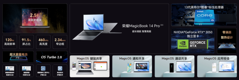 荣耀MagicBook 14系列2023在性能、续航、互联、安全等方面带来全新体验,全系支持MagicOS 智慧互联,搭载13代英特尔酷睿 i5-13500H标压处理器,最高搭配NVIDIA RTX 3050独立显卡,配备75Wh的超大容量电池,整机最大性能释放可达70W,拥有四重护眼认证,在OS Turbo 2.0技术加持下,本地1080P视频播放时长达17小时。荣耀MagicBook 14系列2023首销优惠价4999元起。