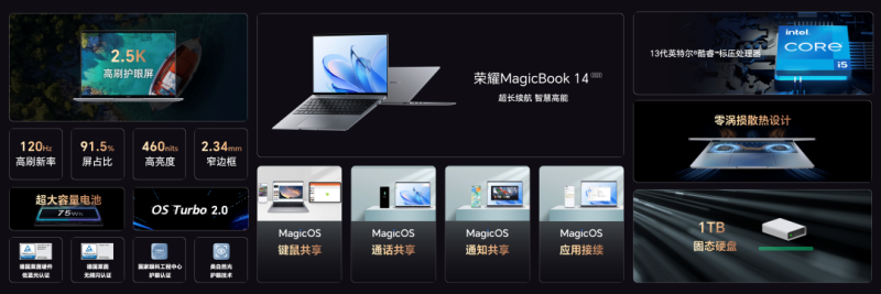 荣耀MagicBook 14系列2023全系支持MagicOS智慧互联,带给用户无感知、无缝流转的操作体验,大大提升效率。MagicOS是荣耀全面实现以人为中心的全场景战略落地,基于MagicRing信任环、Magic Live智慧引擎、Turbo X系统引擎以及MagicGuard荣耀安全四大根技术,带来互联、智慧、流畅、安全等核心能力。其中,MagicRing信任环,让相同账号下的不同荣耀设备在低功耗下实现多设备自发现、自组网、自连接,带来键鼠共享、通话共享、通知共享、应用接续等智慧互联功能,拓宽了终端跨屏应用新场景。