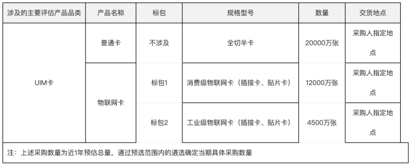 公告显示,本次采购的UIM卡分为两类产品,普通卡为全切半卡,预估20000万张;物联网卡分为两个标包,其中消费级物联网卡(插拔卡、贴片卡)为12000万张,工业级物联网卡(插拔卡、贴片卡)为4500万张。