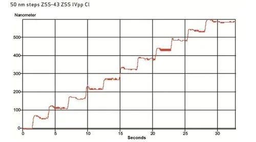 通过利用位置控制,小步的位置行为可进一步改善,尤其是在高分辨率传感器的模拟输出信号被用于处理时。系统管理控制器可处理低至2nm的传感器分辨率,位置分辨率此时仅取决于传感器。然而,环境影响不容忽视:环境温度仅0.01°C的变化就足以造成平台约10nm的热致膨胀。必要时,可使用超精密平台或专门开发的平台,如带花岗岩基座及相应高分辨率线性编码器的平台。图3展示了测量到的配备线性编码器的LS-110平台的最小增量运动。通过精确分离的各步,可清晰看到50nm的分辨率。负载的平稳变化不会影响该精度。