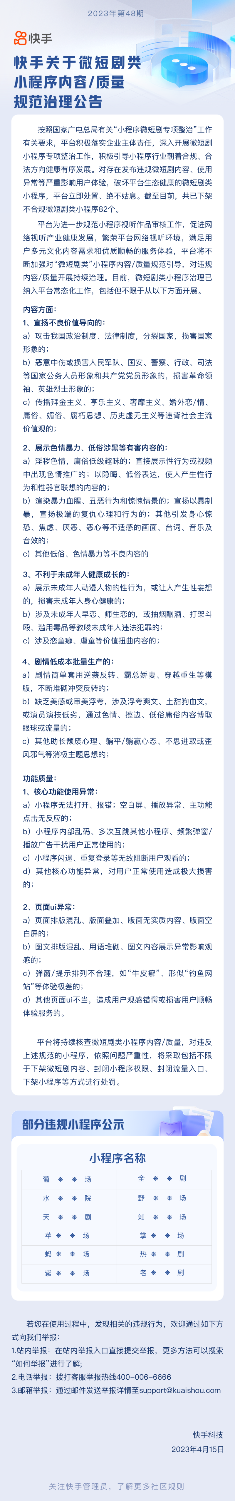 IT之家 4 月 15 日消息,快手发布公告,对存在发布违规微短剧内容、使用异常等严重影响用户体验,破坏平台生态健康的微短剧类小程序,平台立即处置、绝不姑息。截至目前,共已下架不合规微短剧类小程序 82 个。