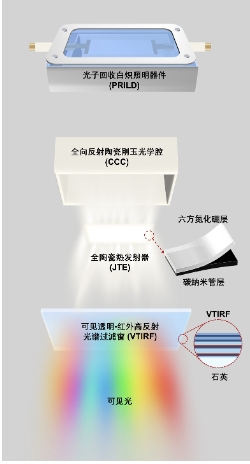 该研究从辐射材料、辐射光谱、光子回收利用等方面出发,设计并制造了一种高光效、高显色指数、长寿命的光子回收白炽照明器件(Photon-Recycling Incandescent Lighting Device, 简称PRILD)。PRILD的主要构成部件包括全陶瓷碳纳米管/氮化硼热发射器、全向反射的陶瓷刚玉光学腔,以及可见透明-红外高反射的光谱过滤窗(Visible-Transparent, Infrared-Reflective Film, 简称VTIRF)等,其结构如图2所示。全陶瓷热发射器可长时稳定运行在2200ºC的高温下,产生高强度、全光谱的黑体辐射,其中的可见光波段的光子可以极低的损耗穿过VTIRF光谱过滤窗,实现高显色指数的人体工学照明,而其余的红外波段的光子被VTIRF光谱过滤窗阻隔,并反射回至全陶瓷热发射器,实现红外光子的回收利用。