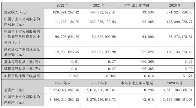 【仪表网 行业财报】4月15日,新联电子(002546)近日发布2022年年度报告,报告期内公司实现营业收入620,691,262.12元,同比增长33.53%;归属于上市公司股东的净利润11,163,126.20元,同比下滑95%。