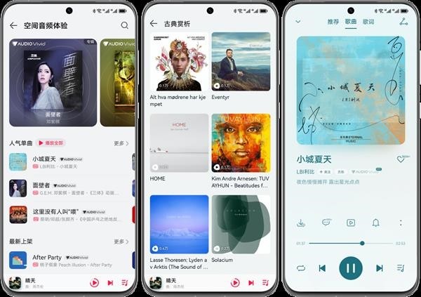 华为音乐还联合古典版权伙伴打造经典作品空间音频版本,推出“空间古典主义”系列专栏,让用户随时随地感受音乐厅中古典音乐的沉浸感。同时,热门歌曲的高清空间音频版也持续上线华为音乐空间音频专区,包含邓紫棋、蔡健雅、许巍、毛不易等头部歌手优质内容。