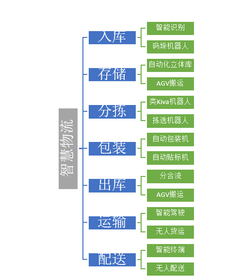 如果以智能作业方式进行划分,智慧物流可分为入库、存储、分拣、包装、存储、运输、配送等环节,每个环节背后又有相应的方案与技术支持,可以划分成不同的类别。