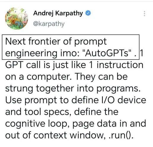 据介绍,AutoGPT是一个开源的AI代理Python应用程序,它以GPT-4作为基础,允许AI自主行动,不需要用户参与中间环节。OpenAI技术大牛Andrej Karpathy更是在推特直言,AutoGPT是“提示(prompt)工程的下一个前沿”。