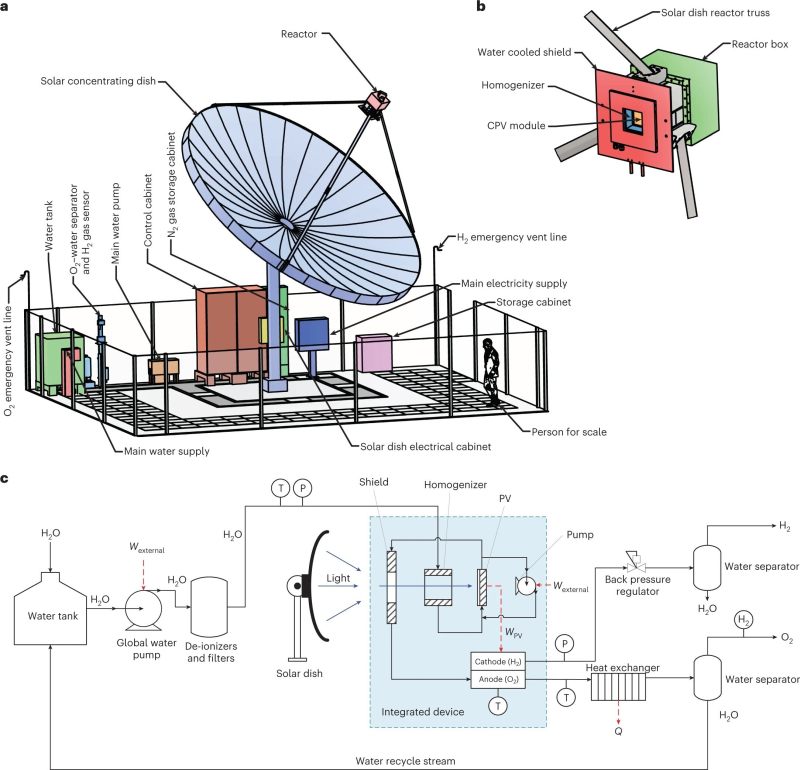 在反射盘聚焦太阳光线后,水被泵入焦点,这里安装着一个集成的光电化学反应器。在这个反应器内,光电化学电池利用太阳能将水分子分解成氢和氧。同时也会产生热量,但这些热量不会作为系统损失释放,而是通过热交换器传导,以便利用,例如用作周围环境的加热。