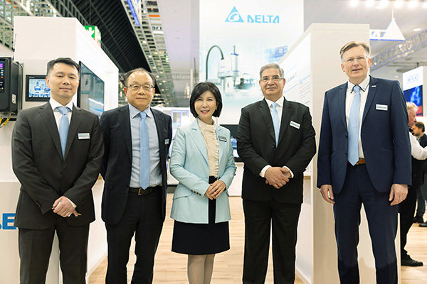 台达首席品牌官郭珊珊(中)、EMEA总裁暨总经理Dalip Sharma(右二)、EMEA能源基础设施资深总监Vincent Lin(左一)、EMEA工业自动化副总裁Tim Lee(左二)、台达EMEA德语区工业自动化副总监Roetger Sander于台达展位合照。