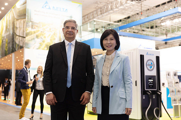 台达首席品牌官郭珊珊(右)及EMEA总裁暨总经理Dalip Sharma带领台达团队参加2023汉诺威工博会。