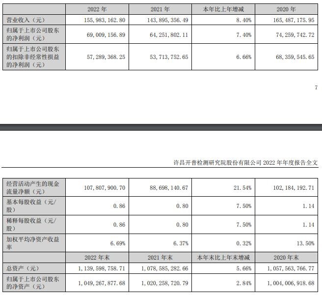 【仪表网 行业财报】4月19日,开普检测(003008.SZ)发布2022年年度报告,报告期公司实现营业收入1.56亿元,同比增长8.40%;归属于上市公司股东的净利润6900.92万元,同比增长7.40%;归属于上市公司股东的扣除非经常性损益的净利润5728.94万元,同比增长6.66%。向全体股东每10股派发现金股利人民币5元(含税)。