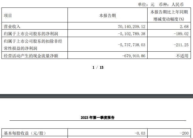 公告显示,公司总资产1,293,067,109.79元,同比减少8.85%;基本每股收益-0.03元,同比减少200%。