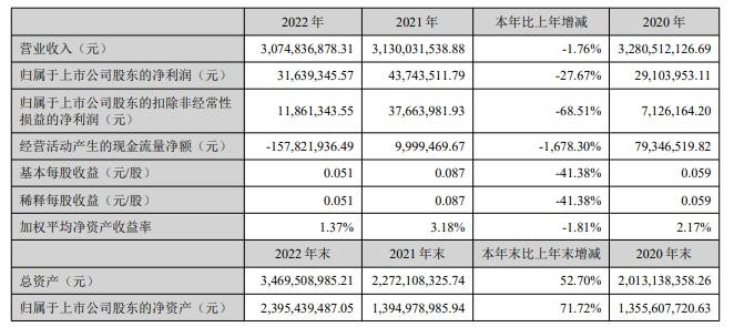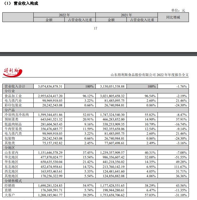 【食品机械设备网 名企在线】4月18日,山东得利斯食品股份有限公司(以下简称得利斯、公司)发布2022年年度报告,报告期实现营业收入30.75亿元,同比下降1.76%;归属于上市公司股东的净利润3163.93万元,同比下降27.67%;基本每股收益0.051元。