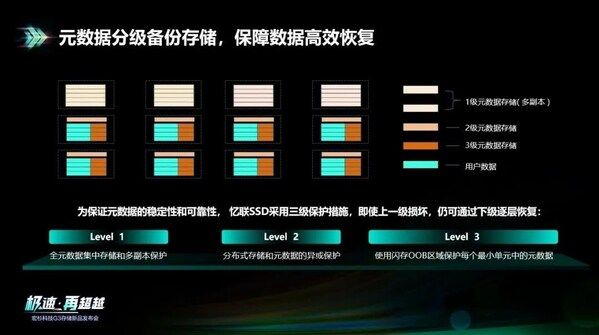 忆联SSD采用三级保护措施,即使上一级损坏,仍可通过下级逐层恢复,可充分保护元数据的稳定性和可靠性。