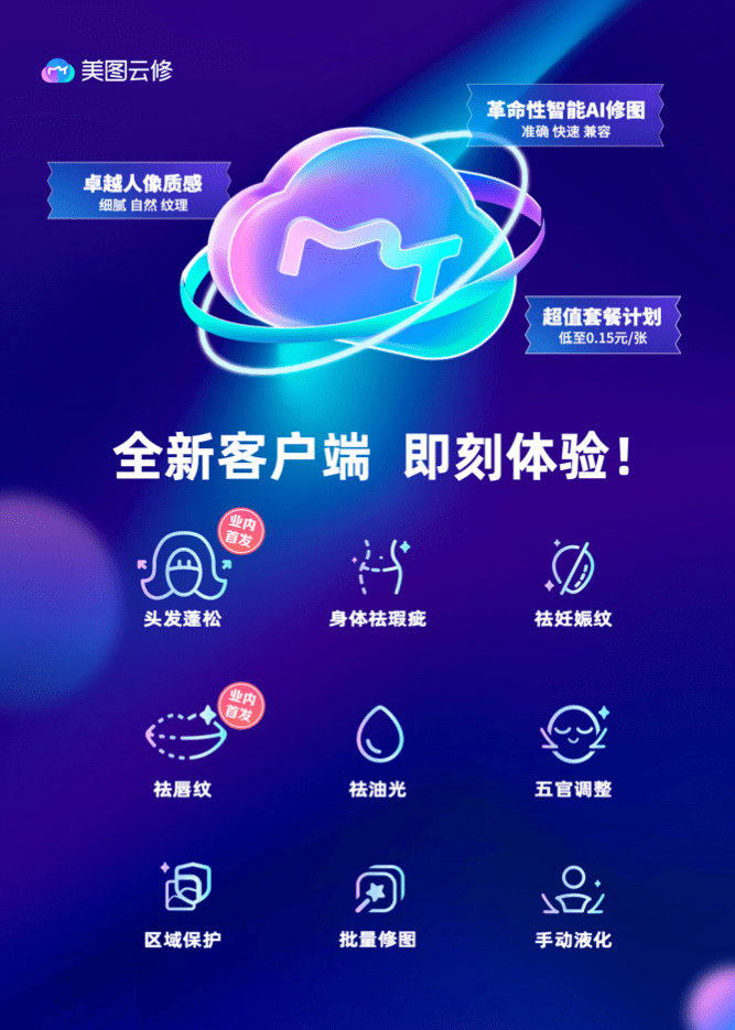 美图云修为本届大会带来了全新5.0.0版本,新增包含业内首发的“头发蓬松”与“祛唇纹”在内的9项实用功能,涵盖“祛妊娠纹”、“祛油光”、“区域保护”等修图刚需,产品性能上实现大幅提升。