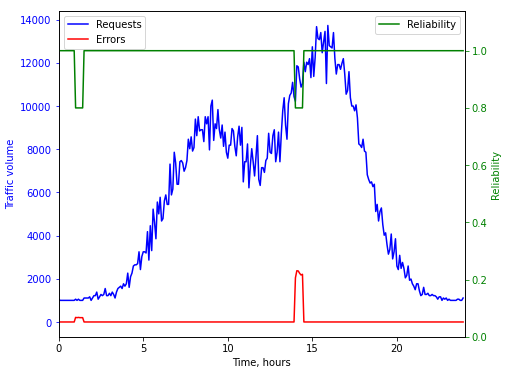 蓝色-每五分钟的请求数,红色-错误,绿色-0..1中的可靠性