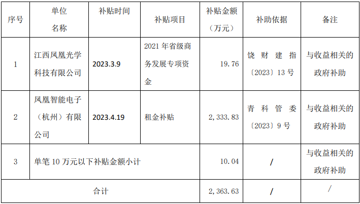 【仪表网 企业动态】4月21日,凤凰光学股份有限公司(以下简称“凤凰光学”)披露关于收到政府补助的公告。2023年1月1日至2023年4月19日,凤凰光学及下属子公司收到各类政府补助7笔,共计2,363.63万元。