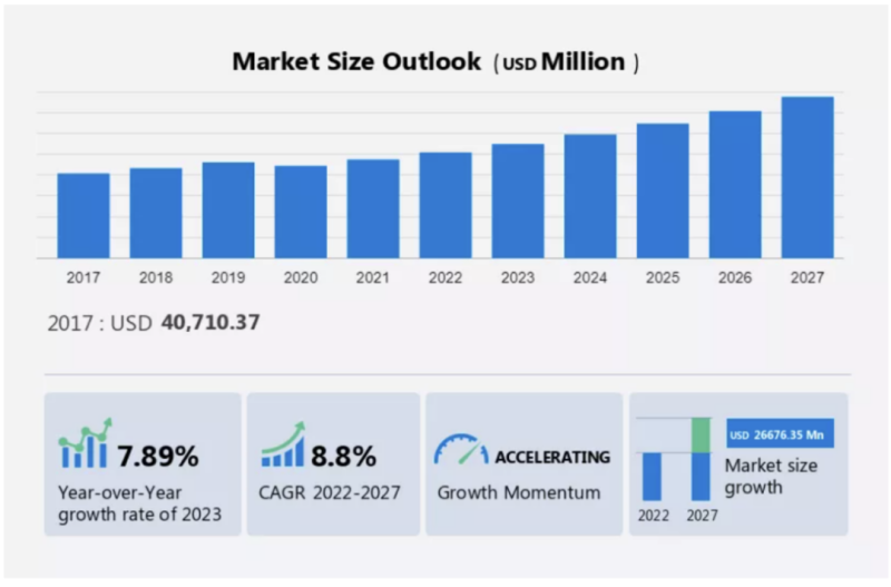 2022 年至 2027 年,汽车半导体市场规模预计将以 8.8% 的复合年增长率增长。汽车半导体市场规模预计将增长 266.7635 亿美元。市场的增长取决于几个因素,包括车辆中高级驾驶员辅助系统 (ADAS) 功能的日益普及、车辆电气化程度的提高以及管理机构强制执行安全法规。
