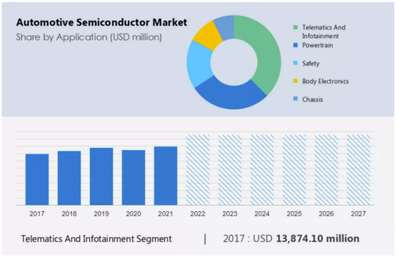 在预测期内,远程信息处理和信息娱乐领域的市场份额增长将非常显著。汽车远程信息处理和信息娱乐系统最重要和最基本的部分之一是汽车半导体。大多数制造商和供应商最近都倾向于提高车辆乘客的安全性。