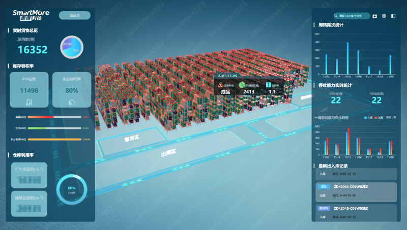 对此,思谋推出了“孪生仓储物流管理解决方案”,创新性地将数字孪生技术引入到仓储物流领域,并在数字孪生平台SMore Light3D基础上,自主研发了覆盖仓储、分拣、配送、管理等集成化的智慧仓储物流系统SMore WMS,集三维可视化、智能运营于一体,利用仿真技术复原仓储物流管控流程,实现仓储作业效率、运营成本与资源利用的优化,帮助企业打造现代化的数智仓储物流体系。
