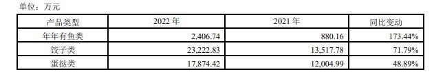 在产品上,2022年千味央厨围绕打造核心大单品开展业务,在保持核心单品优势的基础上,又开始培育和打造其他大单品,部分单品实现了快速增长。其中,“年年有鱼”产品线整体增幅为173.44%;蒸煎饺突破1.8亿元,整体增幅为96.83%,带来饺子类产品71.79%的增幅;蛋挞类产品增幅也不低,达到了48.89%。千味央厨在年报中表示,在产品策略上将继续围绕油条类、蒸煎饺类、烘焙类、米糕类四大优势产品线,同时加大其他大单品的开发和推广力度,争取在未来3-5年内形成3-5个亿元核心大单品。