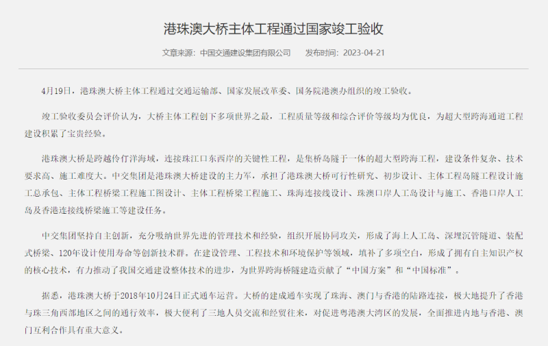 IT之家 4 月 22 日消息,港珠澳大桥主体工程通过交通运输部、国家发展改革委、国务院港澳办组织的竣工验收。竣工验收委员会评价认为,大桥主体工程创下多项世界之最,工程质量等级和综合评价等级均为优良。