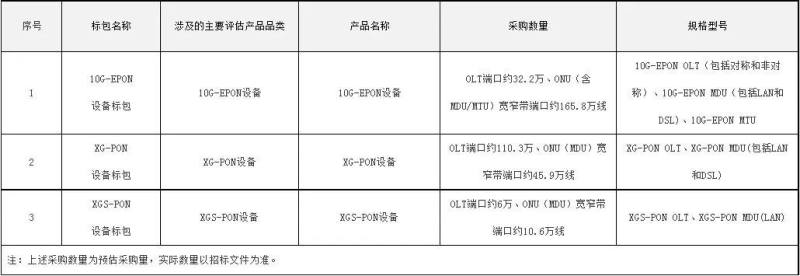 公告显示,中国电信本次PON设备集采,主要涉及的产品为:10G-EPON设备、XG-PON设备、XGS-PON设备三种设备。其中10G-EPON设备采购规模为:OLT端口约32.2万、ONU(含MDU/MTU)宽窄带端口约165.8万线;XG-PON设备采购规模为:OLT端口约110.3万、ONU(MDU)宽窄带端口约45.9万线;XGS-PON设备采购规模为:OLT端口约6万、ONU(MDU)宽窄带端口约10.6万线。